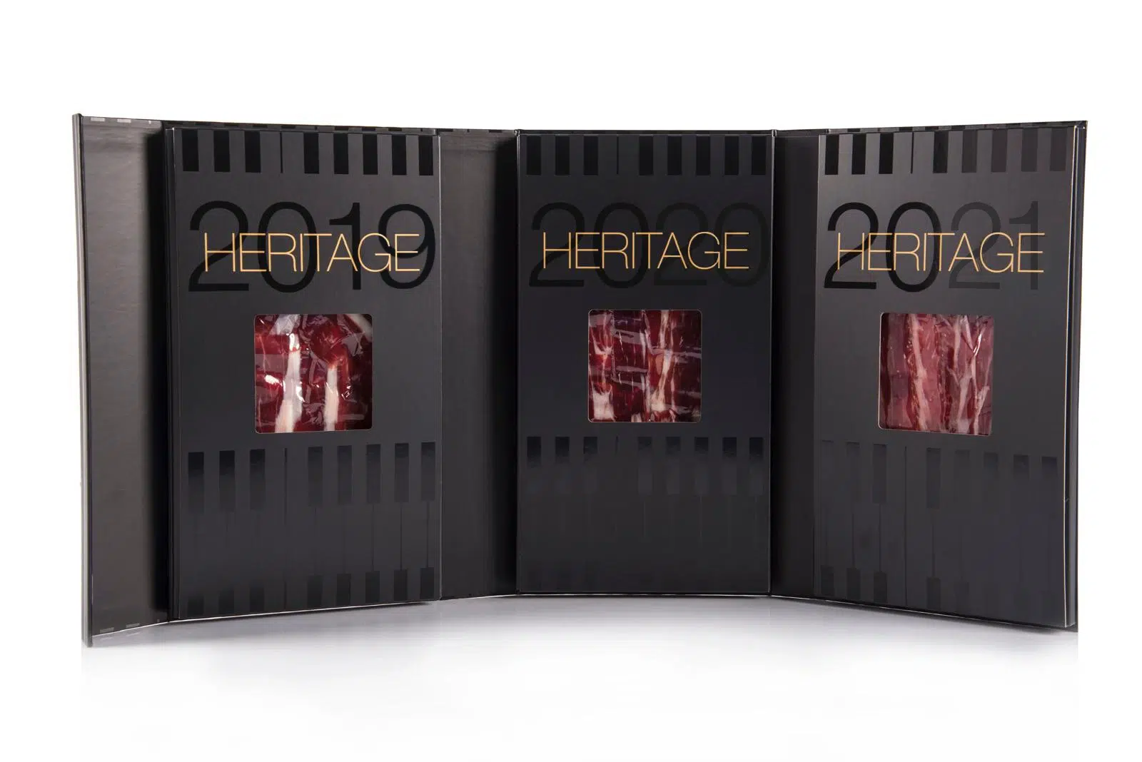 Cada año es diferente: vivimos a merced de los caprichos de la naturaleza. Hay años cargados de días secos y fríos. Otros, con más vientos del sur acalorado. Hay años que obedecen a la lógica del calendario y otros que revolucionan los parámetros de las estaciones. El misterio y el arte del jamón recogido en un pack de tres añadas para degustar con perspectiva.
