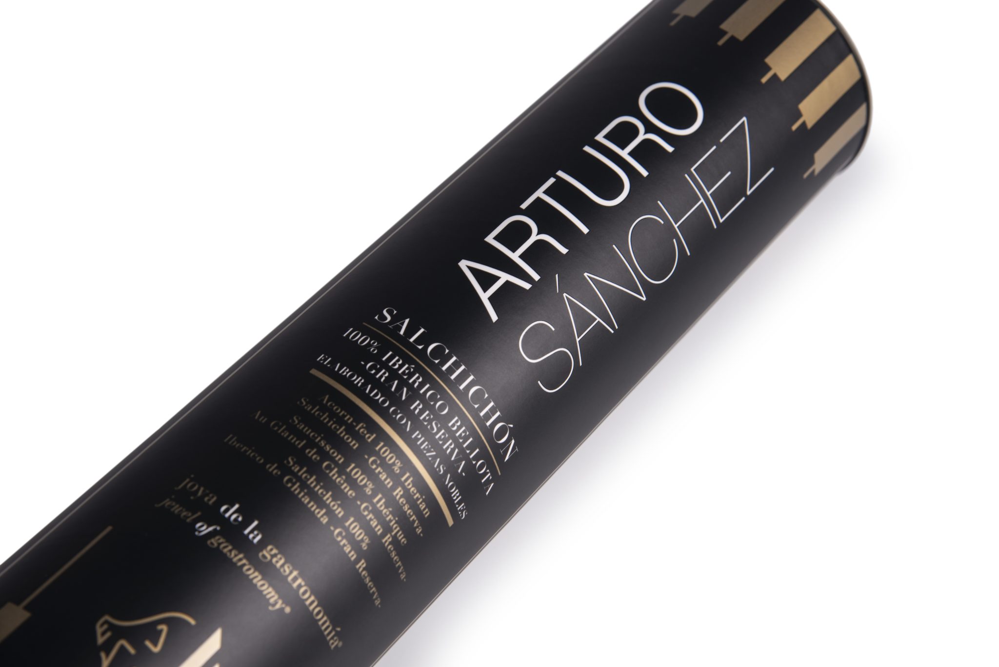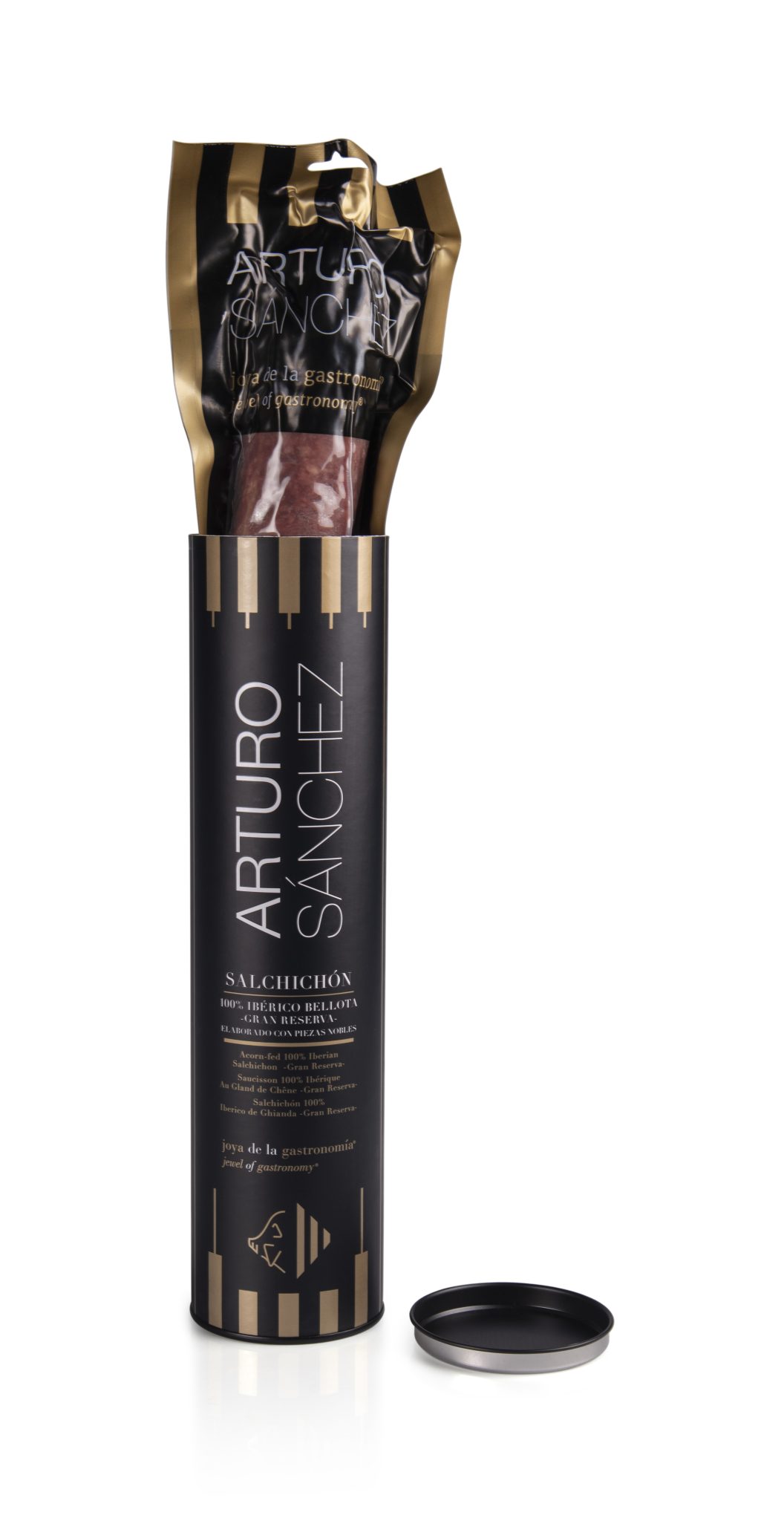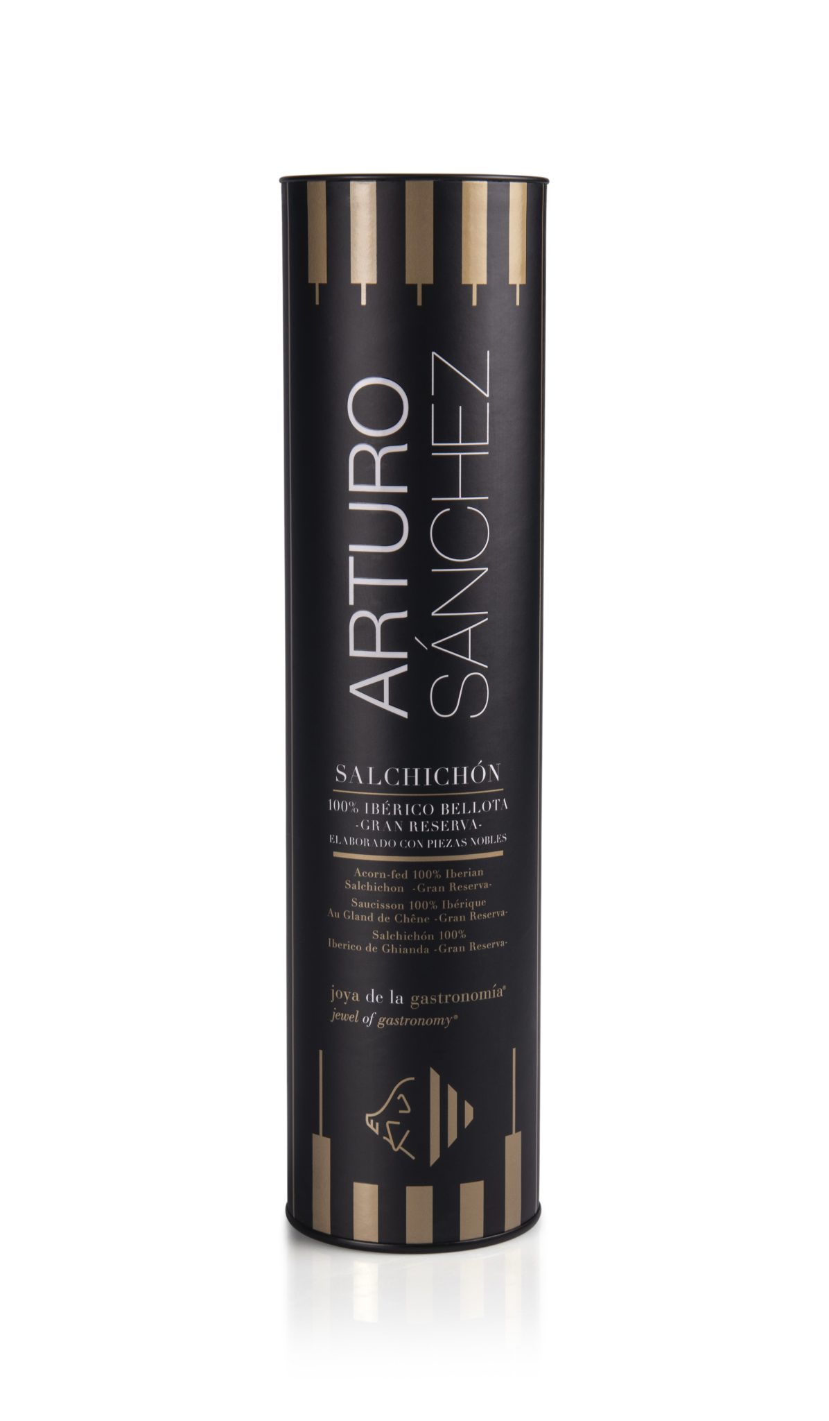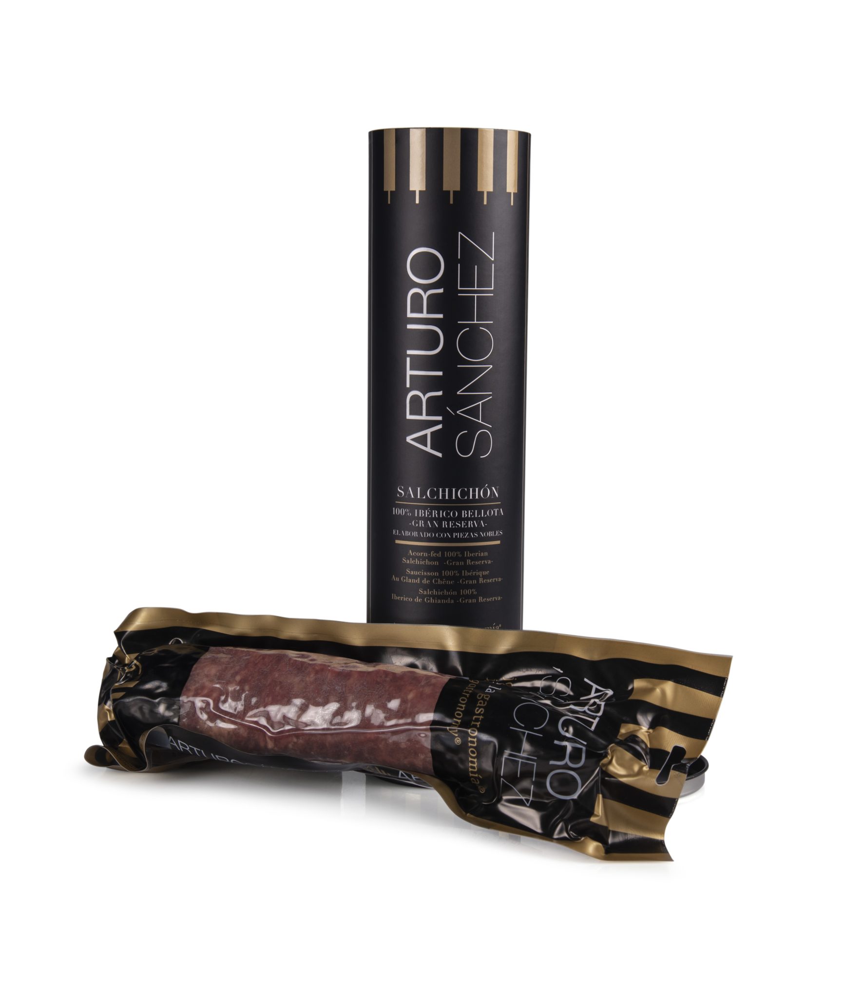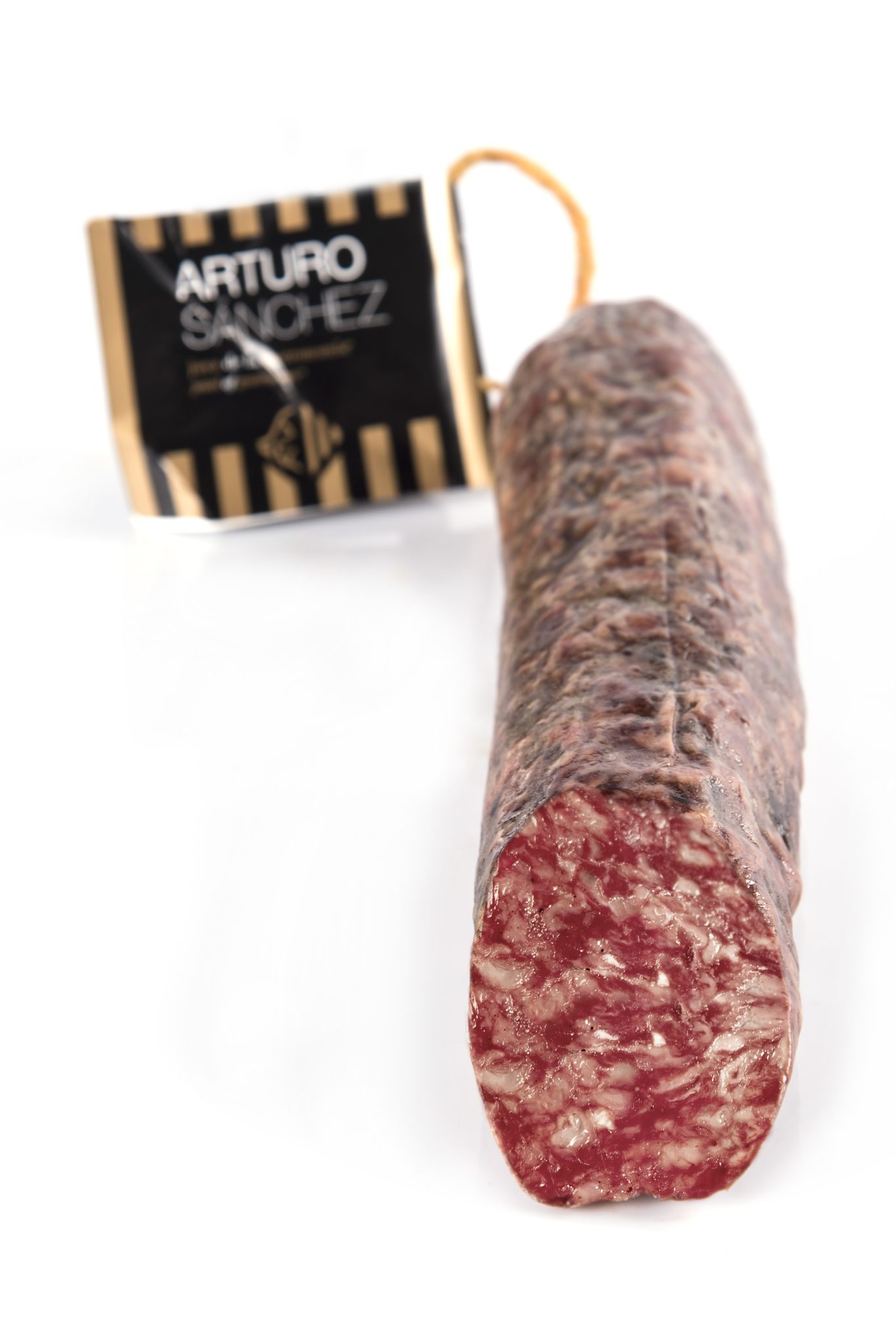El salchichón ibérico de bellota es la expresión del carácter Arturo Sánchez, el más difícil de elaborar y un orgullo en nuestra familia. La anterior generación fue el primero en crearlo y su receta permanece guardada bajo llave. Embuchado en tripa natural Cular y elaborado a base de presa, pluma, secreto y manto de cerdo ibérico de bellota de doble montanera. Su receta apenas ha variado en cuarenta años y en ella no hay medidas en gramos ni método de elaboración mecánico, sólo la receta maestra, porque lo demás es nuestro saber hacer. No hay forma de transcribir un legado que en esta familia se aprende en vida, desde niño, oliendo, tocando, probando. Al principio, era un regalo para amigos, hoy es un manjar admirado dentro y fuera de nuestras fronteras. Nos dicen que no se parece a ninguno, que es incomparable. Tiene carácter propio porque nadie más lo hace así. Su fundamento es también la carne más selecta, el secado en campana con leña de encina y la curación natural durante medio año. El resto es un misterio para los que intentan imitarlo. Para nosotros, un tesoro que nos define, un homenaje a nuestra historia. Su sabor a pura tradición, reconocible al instante, auténtico, puro y fino, lo convierten en una pieza diferente, con personalidad y realmente seductora. Disponible en estos formatos: pieza entera y loncheado.